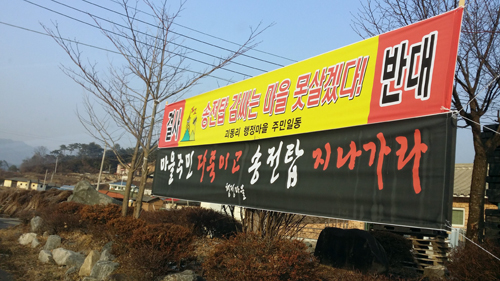 이 마을 주민인 남성진 씨도 반대입장을 분명히 했다. 남씨는 “주민설명회를 했다고 하는데 음료수와 과자 몇 개 갖다놓고서 70~80대 노인들에게 ‘이렇게 지나갑니다’하는 것이 일방적인 통보지 그것이 무슨 설명회냐. 더구나 한전 직원은 우리에게 ‘동의하지 않으면 밀양처럼 밀어 붙이겠다’고 엄포를 놓는 등 강제 집행하겠다는 뜻을 밝혔다”고 목소리를 높였다. 이어 “지금 비상대책위원회를 꾸린 상태고 조만간 시청 등에서 결사 반대시위를 할 것”이라고 피력했다.