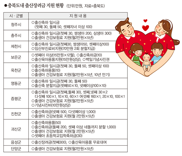 저출산 대책으로 전국 많은 지자체들이 시행하고 있는 것이 출산장려금 지급이다. 지자체가 아동양육이나 보육비로 주는 것 외에 출산과 관련해서 돈을 주는 것으로는 출산장려금이 대표적이다. 충북도는 출산장려 및 양육지원에 관한 조례에 의해 11개 시·군에 출산장려금을 내려 보낸다. 도내 시·군은 여기에 자체 예산을 합쳐 지급한다.