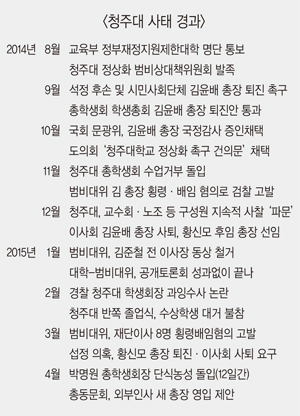 하지만 취임 4개월이 지나도록 황 총장은 청주대 사태를 한발짝도 진전시키지 못했다. 총학생회장의 12일 단식농성과 이사진 총사퇴 요구 등 반발수위가 더 높아졌다. 김윤배 전 총장의 ‘깜짝 쇼’같은 ‘아바타 총장’ 선임은 실패한 실험으로 굳어지고 있다. 황 총장의 학자적 양심과 비대위의 총체적 성찰이 청주대의 새 희망에 밑거름이 되야할 시점이다.