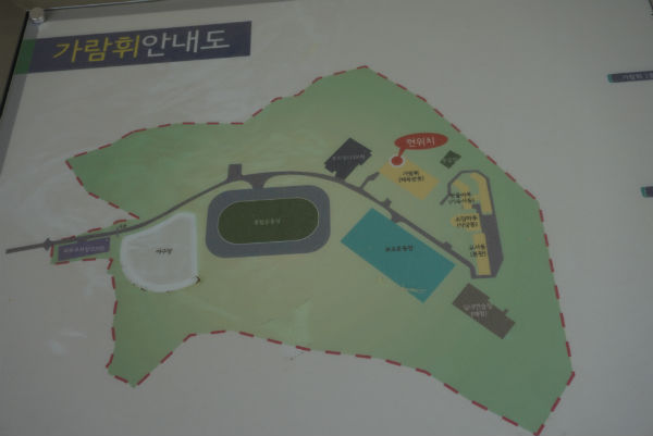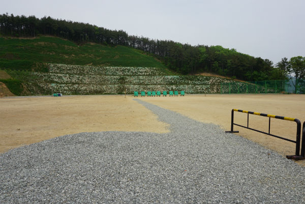 누군가가 이곳 운동장에서 야구 경기를 한 흔적은 보이지 않았다. 야구장 내야를 살짝 벗어난 운동장 가운데 지점에는 가로등과 양궁 과녁 표지판 9개가 설치돼 있었다. 과녁 표지판에서 50m 길이에 폭 1m 이상으로 파쇄 된 자갈이 덮여 있었다.