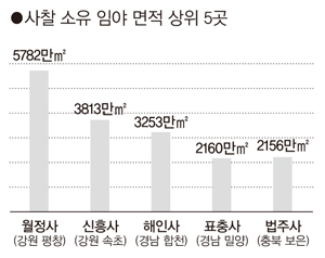 오대산 월정사는 5782만㎡(1749만평)로 단일 사찰로는 최대 규모다. 속리산 법주사는 2156만㎡(652만평)으로 전국 5번째 순위이며 서울 여의도 면적의 2.5배에 해당한다. 공시지가 기준으로 조계종이 소유한 땅의 가격은 5천억원대에 이른다. 하지만 종단이 소유하고 있는 재산은 ‘사유 재산’과는 다른 개념이라는 시각도 있다. 특정 개인 소유가 아니고 종단의 운영, 사회 사업 등에 쓰여지는 공익 재산이라는 것이다. 이같은 취지로 우리나라는 종교재산에 대해 과세하지 않고 있다.