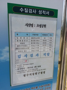 아쉬운 것은 물에 대한 수질·수량 자료가 거의 없다는 것이다. 주민들 사이에서는 초정광천수의 톡쏘는 성분이 줄어들고, 이렇게 퍼 쓰다가 언제 고갈될지 모른다고 걱정하는 소리가 높다. 공원내와 원탕 주변 두 곳 등에 수질검사 성적서가 걸려있을 뿐이었다. 청주시 청원구청에서 조사하는 검사서에는 일반세균·대장균·암모니아성 질소·과망간산칼륨소비량 등에 대해 나온다. 세 군데의 성적서에는 ‘적합’으로 표시돼 있다.