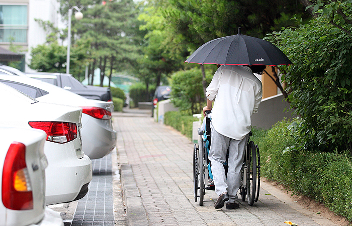청주시 서원구 분평동 한 아파트에서 정민순(45.가명)씨가 갑자기 내린 소나기에 우산을 들고 아들이 탄 휠체어를 힘겹게 끌고 간다. 이 아파트에는 장애인 주차장이 있건만 이미 비장애인들이 주차해 놓았다.