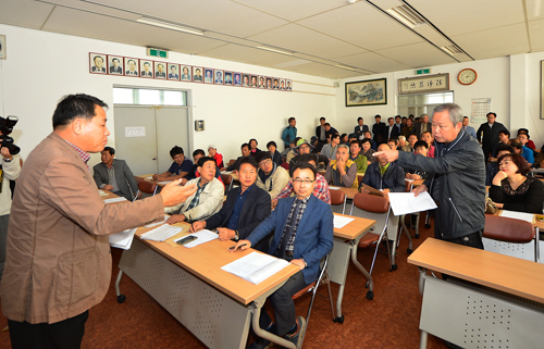 13일 율량사천동 주민센터에서 열린 새터지구 도시개발사업 주민설명회장은 공영개발을 반대하는 토지주 등이 대거 참석해 목소리를 높였다. 지난달 24일 기자회견을 열어 독자추진을 선언한 김충구 청주새터지구 도시개발사업 추진준비위원장은 이날도 주민설명회를 중단시키며 “충북개발공사가 난개발을 방지한다는 명분으로 새터지구를 개발하려고 하지만 충북개발공사가 주민들의 사유지를 가지고 난개발을 걱정할 이유도 자격도 없다”며 토지주들의 동참을 호소해 설명회가 20여분 지연됐다.