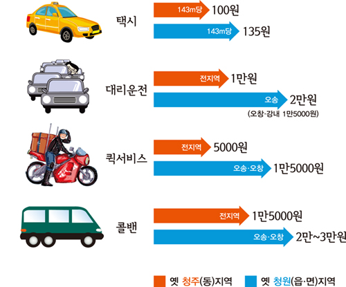 청주 퀵서비스 업계에서는 시내권 5000원, 청주역 등 3차 우회도로 부근 8000원, 오창‧옥산‧오송은 1만 5000원을 받고 있다. 물론 출발지와 거리는 고려하지 않고 있다.
