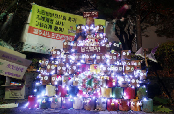 연탄트리 1호도 설치됐다. 지난 3일 림민 작가는 청주시노인전문병원 소속 조합원들이 농성장 주변에 1호 연탄트리를 설치했다. 이에 대해 권옥자 노조 분회장은 “완전 대박! 집회보다 트리가 더 주인공이었어”라며 즐거워했다. 림민 작가는 “소외된 이웃 모두 소망하는 것이 이루어졌으면 좋겠다”고 밝혔다.