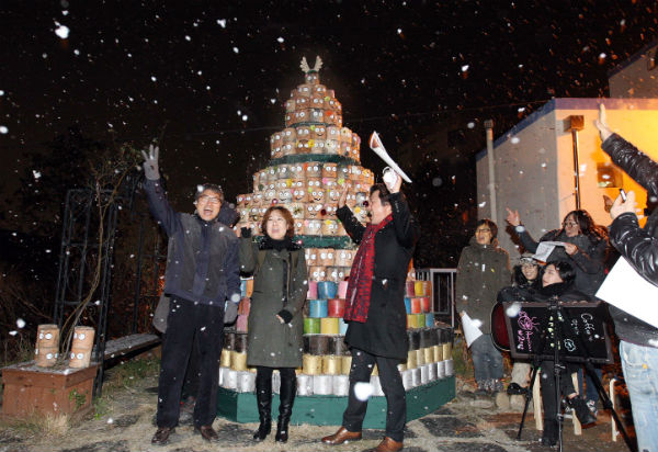 지난 16일 저녁 수암골 하늘다방에 설치된 연탄트리가 환하게 점등되는 순간 하늘에선 함박눈이 내렸다. 점등식을 보기 위해 모인 70여명의 시민들은 환호성을 질렀다. ‘이게 최선입니까’ 최 선 씨의 기타 반주에 맞춰 ‘깜짝놀랄 네자매’(권은숙, 김상윤, 이지은, 유선우)의 선창으로 합창이 시작됐다.