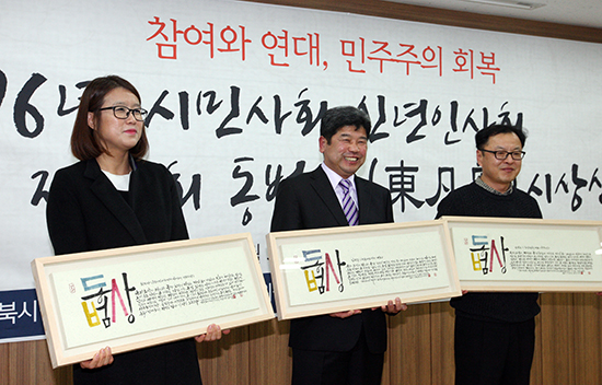 5일 충북시민사회단체연대회는 충북NGO센터에서 시상식을 열고 수상장에게 상패를 전달했다. 영예의 동범상 수상은 최진아 충북시민사회단체연대회의 사무국장, 신건준 한살림 충주·제천 사무국장, 김광복 행복나눔계란 대표가 안았다.