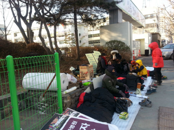 화단 설치이후 남아 있는 공간은 폭 2m 정도가 유일했다. 그리고 노인병원 노조는 화단 앞에 천막을 설치했다. 그리고 이들이 있던 자리는 철제 울타리가 처졌다.