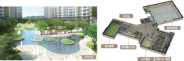 세대당 1.5대의 주차대수가 제공되고, 지하주차장은 모두 20cm가 넓은 광폭주차장으로 지어진다. 탁구, 농구, 배드민턴 등을 즐길 수 있는 단지 내 다목적 실내체육관이 지어지고, 쾌적한 수변공원인 아쿠아가든도 배치된다.