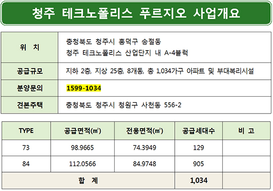 충청북도 청주시 흥덕구 송절동 청주 테크노폴리스 산업단지 내 A-4블럭에 들어서는 ‘청주 테크노폴리스 푸르지오’는 지하 2층, 지상 25층, 아파트 8개동의 총 1,034가구 대단지 아파트로, 전용면적 △73㎡ 129세대, △84㎡ 905세대로 구성된 중소형 평형 단지이다.
