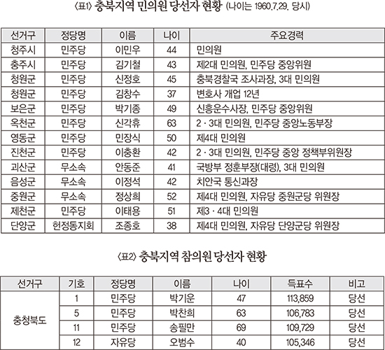 충북지역 4석의 참의원은 민주당 3석, 자유당 1석으로 민주당이 압승했다. 전국적으로는 참의원 총 58석 중 민주당이 31석을 차지했고, 무소속이 20석을 차지했다.