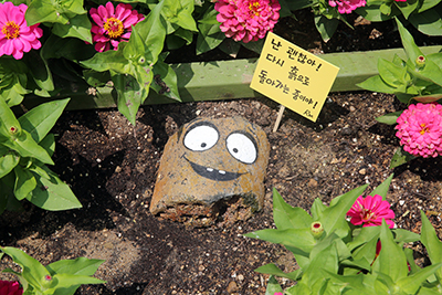 이곳에는 해바라기, 가지, 각종 허브와 꽃들이 심어져 있다. 이들이 식재된 화분도 흥미롭다. 화분으로 사용되는 것은 림민작가가 만든 연탄작품. 가운데 홈을 파고 이곳에 식물을 심었다. 구멍이 뚫린 연탄화분의 특성상 다육식물처럼 물을 많이 필요로 하지 않는 식물을 심는다. 아직 초반이라 연탄화분의 숫자는 많지는 않다.