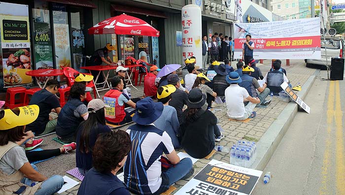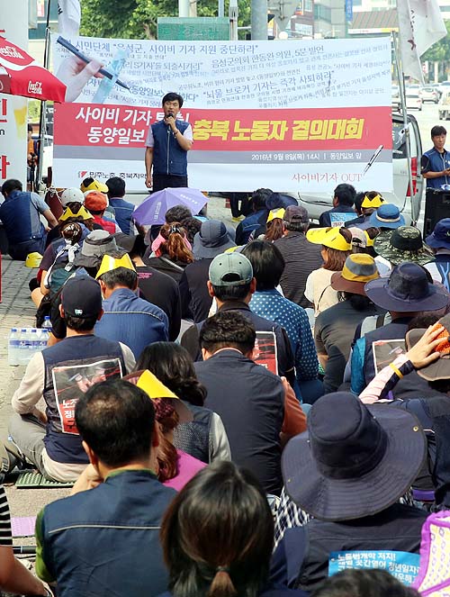 민주노총 충북지역본부는 8일 동양일보 사옥 앞에서 공무원노조와 금속노조원들이 모인 가운데 ‘사이비 기자 퇴출 동양일보 규탄 충북노동자 결의 대회’를 가졌다.