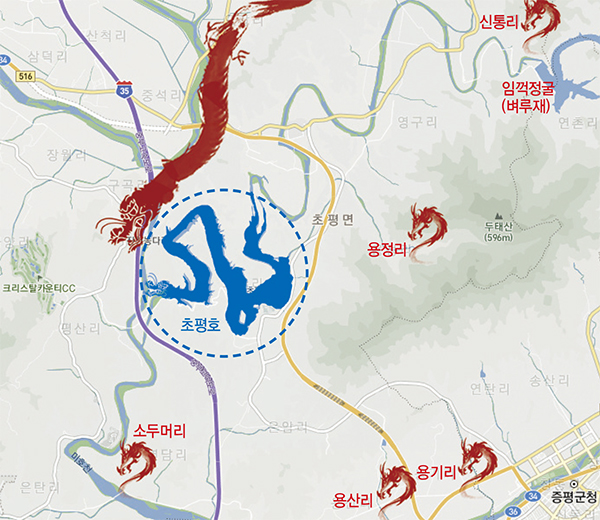 초평호의 동쪽에는 두 마리 용이 승천한 용정리가 있다. 동남쪽에는 용의 터전인 용기리 용전마을이 자립하고 있다. 남쪽과 남서쪽으로는 용의 꼬리 지형을 한 평사리 용미촌, 소두머니의 동룡대와 서룡대가 자리한다. 또 용이 강을 건너는 형세인 도룡골도 있다.