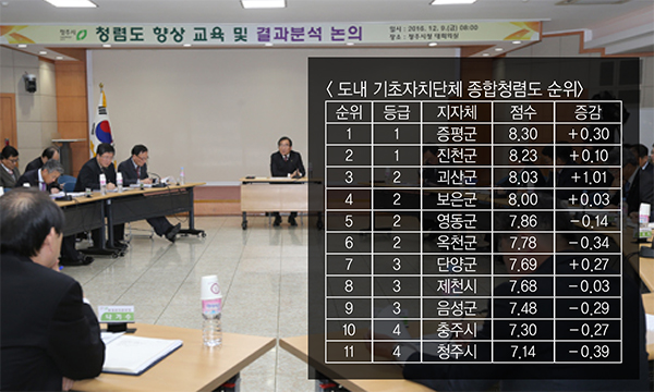 증평군과 진천군은 기초차지단체(군)에서 1등급에 오르며 상대적으로 높은 청렴도를 과시했다. 특히 증평군과 진천군은 각각 8.30점과 8.28점을 기록하며 비슷한 규모의 82개 기초자치단체 가운데 전체 1·2위를 차지했다. 증평군은 특히 외부청렴도에서 지난해보다 0.36점이나 크게 오른 평가를 받아, 군민 등 민원인들에게 후한 평가를 받은 것으로 나타났다.