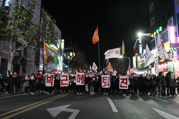 박근혜 대통령의 단핵 안 가결을 이끈 촛불민심이 식지 않고 있다. 지난 17일 오후 5시 청주 성안길 입구에서 시민 1000여명이 모여 ‘4차 충북 범도민 시국대회’가 열렸다.