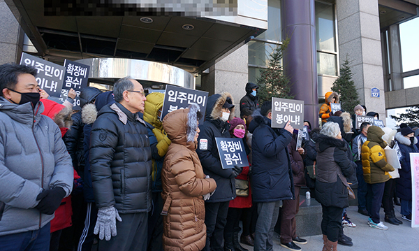 지난주부터 원건설 사옥 앞에서 1인시위를 이어가고 있는 가마지구 힐데스하임 아파트 입주 예정자들이 발코니 확장 공사비를 납부하지 않겠다는 강수를 띄웠다. 이들은 지난 16일 원건설 사옥 앞에서 집회를 열고 “부당거래, 불공정거래를 중단하라”고 주장했다.
