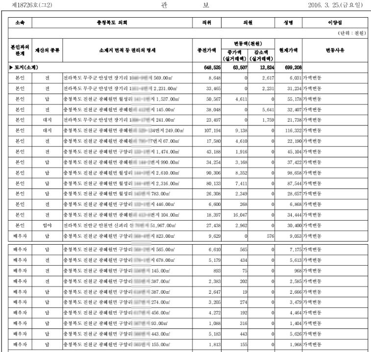 이 의원이 관보에 공개한 재산자료에 따르면 이 의원 부부가 2015년 소유한 농지는 23필지 1만3341㎡에 4억9030만6000원 이었다. 하지만 1년 후 해당 농지는 4144만2000원이 오른 5억3174만8000원에 달했다. 상승률은 8.5%에 달했다.