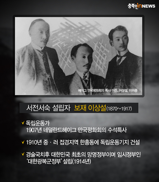 이상설 선생은 충북 진천 태생으로 27세에 성균관장에 임명된 유학자이자 최초로 망명임시정부를 세운 독립운동가다. 또 우리나라 최초로 가로쓰기 산수 교과서를 편찬했고 근대식 교육기관인 서전서숙을 세워 최초로 무상교육을 실천했다.