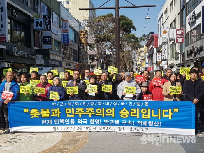 헌법재판소 결정이후 도내에서 박근혜 대통령 탄핵운동에 앞장서온 ‘박근혜정권퇴진충북비상국민행동’은 10일 오후2시, 기자회견을 열고 “촛불과 민주주의의 승리다. 헌재의 탄핵인용을 적극 환영한다. 박근혜를 구속하라”고 요구했다.