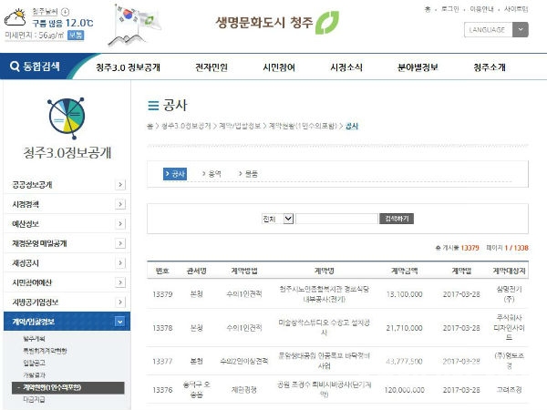 진천군이 모범사례인데 반해 청주시와 음성군 같은 경우에는 개선해야 할 지점이 많다. 청주시의 경우 진천군처럼 엑셀화일을 다운로드하는 서비스를 제공하지 않는다. 또 동일한 내용이 중복 기재돼 있다.