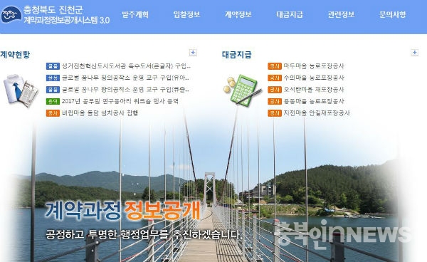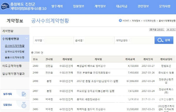 이런 수의계약 현황도 각 지자체 홈페이지를 접속하면 누구나 쉽게 볼 수 있다. 진천군청 홈페이지를 접속해 ‘3.0정보공개’를 클릭하면 진천군 계약과정정보공개시스템을 접속 할 수 있다. 이 코너에 접속하면 진천군이 시행한 각종 수의계약 정보를 확인할 수 있다.