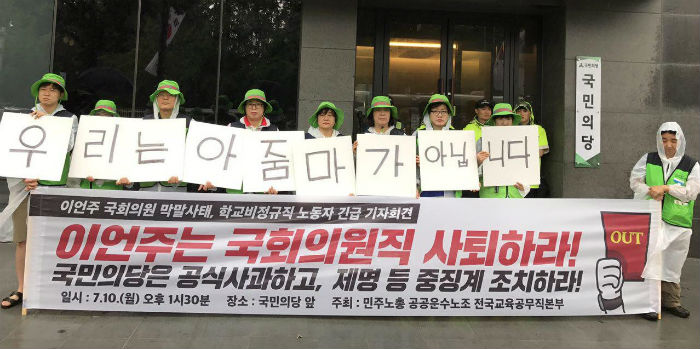 학교 급식소에서 일하는 노동자에게 “급식소에서 밥하는 아줌마”, “그냥 동네아줌마”, “밥하는 아줌마가 왜 정규직화가 돼”라는 이언주(국민의당) 국회의원의 발언에 노동자들이 울컥했다.