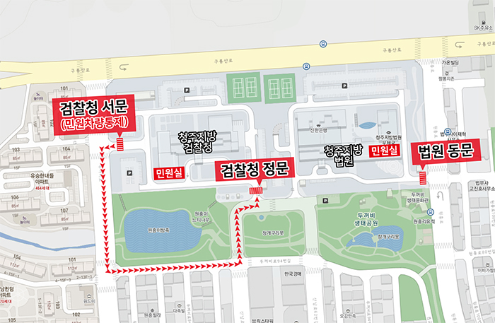 결국 청내 주차장 관리와 청원경찰의 업무편의를 위해 서문은 막고 정문으로 일원화시킨 것으로 분석된다. 문제는 그동안 검찰청 방문 민원인들의 대부분이 서문을 이용해 왔다는 점이다. 실제로 청주지방법원, 검찰청사의 전체적인 설계를 보면 4차선 도로를 접한 쪽에 동문, 서문을 내도록 했다. 또한 두 청사 모두 동문, 서문과 가장 가까운 위치에 청사내 종합민원실을 배치했다. 결국 검찰청의 서문 통행제한 조치는 당초 설계 취지를 무색하게 하는 결정인 셈이다.