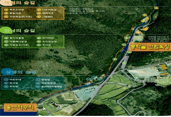군은 용산저수지 둘레길~봉학골 산림욕장에 이르는 기존 동선의 연계를 통하여 산림훼손을 최소화하고, 평균경사 5%의 완만한 산책로를 조성하여 휠체어나 유모차 이동에 불편이 없도록 한다는 방침이다.