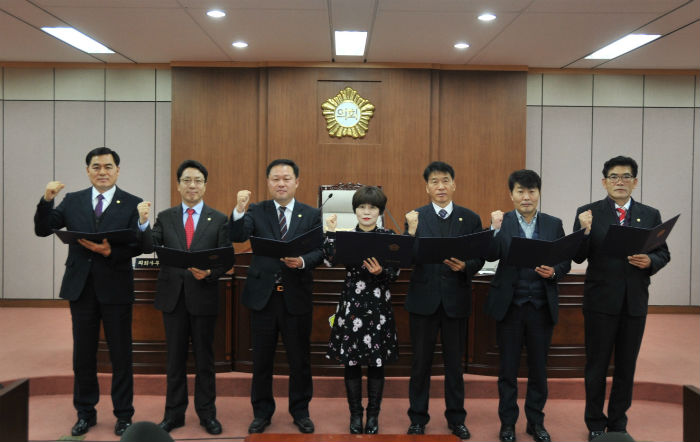 충북 증평군의회 의원들은 8일 본회의장에서 지방분권 개헌 대성공약 이행을 촉구하는 결의문을 발표했다.