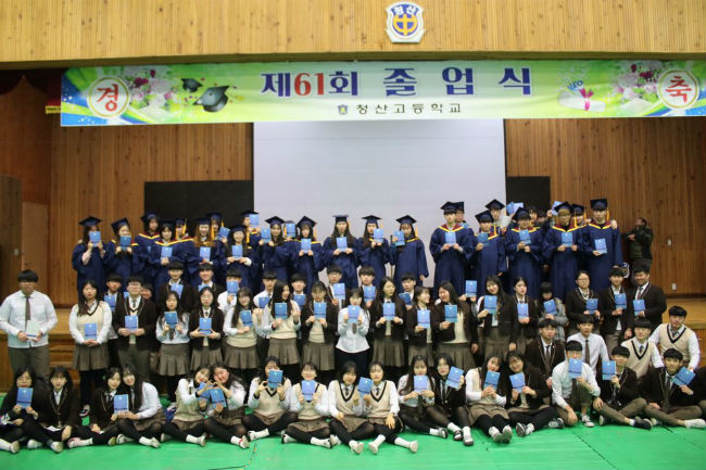 청산고는 30일 열린 졸업식에서 32명의 졸업생을 포함한 전교생 88명과 학부모, 지역주민에게 나눠주며 졸업생들의 새로운 시작을 축복하기도 했다.