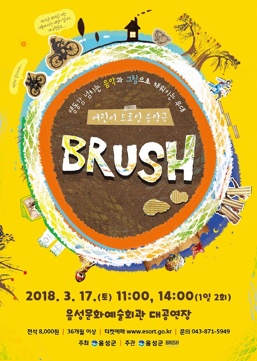 ‘어린이 드로잉 음악극<브러쉬>’는 음성군이 주최하고 음성군과 브러쉬씨어터가 주관하며 36개월 이상 관람 가능한 공연으로 전석 8천원으로 음성문화예술회관 홈페이지(www.esart.go.kr) 및 전화(043-871-5949) 예매 가능하다.