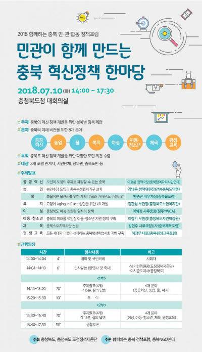 ‘함께하는 충북 민·관 정책포럼’과 충북NGO센터는 공동으로 오는 7월 10일 오후 2시부터 5시 30분까지 충북도청 대회의실에서 ‘충북의 혁신정책 개발을 위한 분야별 정책 제안’이라는 주제로 ‘민·관이 함께 만드는 충북 혁신정책 한마당’을 개최한다.