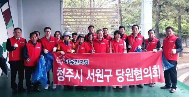 자유한국당 충북 청주시 서원구당원협의회 소속 당원들이 서원구 일대 환경정화 봉사 활동을 펼쳤다.