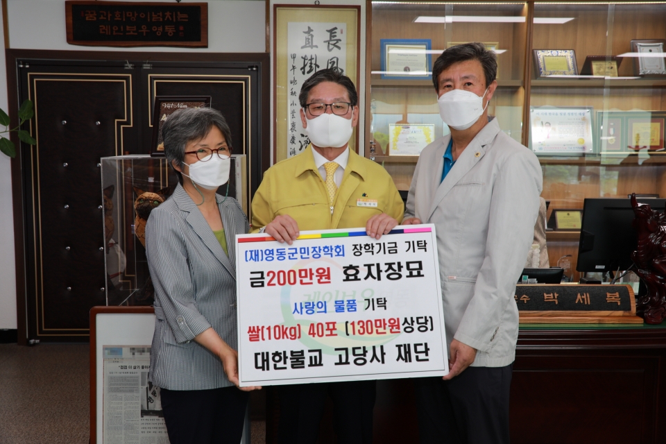 영동군 심천면 고당리 소재 대한불교 고당사재단은 관내 어려운 이웃을 위해 지원해달라며 130만원 상당의 사랑의 쌀 10kg 40포를 영동군 ‘레인보우 행복나눔’ 사업에 기탁했다.