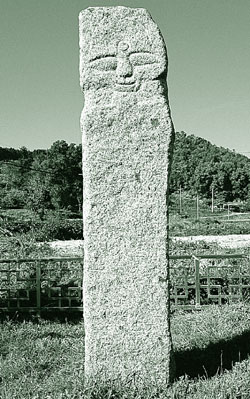 ▲ 청주시 용정동 이정골 선돌. 마을사람들은 물이 내려가는 수구를 막아준다는 생각에서 수구맥이라고도 했다. 청주시 상당구 용정동(龍洞洞) 이정골에서 마주친 돌기둥모양의 선돌(立石) 얼굴은 청주의 캐릭터가 분명했다. 얼굴이 못 생겨서 죄송한 마음이기는 하나, 캐릭터가 예쁘거나 잘나야 한다는 법은 없다. 그 보다는 삶의 풍토와 관습이 같은 공동체 사람들이 지닌 어떤 공통분모(共通分母)의 문화적 심성에 더 무게를 싣는다. 바로 캐릭터의 내면성(內面性)이기도 하다. 이정골 선돌에는 '순치9년7월16일입(順治九年七月十六日立)'이라는 새김글씨가 들어있다. 1652년에 세웠다는 이야기다. 백성들이 청주성(淸州城)탈환같은 의병전쟁에 뛰어들어 임진왜란을 몸소 치른지 꼭 반세기가 되는 해였다.그런 미증유의 난리를 딛고 다시 일어선 민중들은 웃음을 다 잃지 않고 내일을 기다렸다. 분노를 터뜨렸다가도 이내 삼켜버리고, 평상심(平常心)으로 돌아올 줄도 알았다. 그런 착한 사람들이 지었으니, 선돌인들 얼굴을 구길리가 없다. 선돌의 몸통은 길다란 네모꼴에 가깝다. 그 위에다 얼굴을 돋을새김으로 그렸다. 눈은 슬며시 감았다. 그래도 무엇을 보았는지 웃고싶은 모양이다. 아마 이정골 사람들의 잃지 않은 웃음을 보았을 것이다.얼굴 윤곽은 솔직히 말해서 두루뭉술하다. 코 밑 언저리는 약간 낮추어 코가 그런대로 드러났다. 입은 가로로 길게 그렸다. 그러나 입은 눈과 눈썹, 펑퍼짐한 주먹코에 비해 작다.아랫 입술 언저리에서 입가를 따라 올라간 선이 턱을 좁게 마감하다가 볼로 올라붙었다. 그래서 광대뼈가 꽤 튀어나왔다. 이타(利他)의 착한 마음을 가진 것은 틀림없으나, 어딘가에 호락호락하지 않고 고집스러운 구석이 보이는 까닭은 광대뼈 때문이리라. 청주의 캐릭터가 거기 있다. 또 광대뼈는 북방(北方)에 뿌리를 두었다는 민족의 기원을 거슬러 올라가 보면, 청주 사람들 원초(原初)의 캐릭터이기도 했다.얼굴 생김새는 장승*을 연상하기 십상이다. 키가 3m나 되어 장승으로 보는데 더욱 무리가 없다. 그러나 이마에 돌을 새김한 백호(白毫)가 너무 뚜렷하여 장승이 아니라는 제동이 걸린다. 불상으로 생각하는 또 다른 이유는 새김글씨에 나오는 화주(化主), 시주(施主), 비구(比丘) 따위의 불교용어에 있다. 그래서 의도적으로 부처 얼굴을 형상화한 것이라는 주장이 나올 만도 하다.부처라 해도 좋고, 장승으로 불러도 시비할 사람은 없다. 달리 바라보면, 잠을 일부러 청할 겨를도 없이 코를 골아대다 새벽녘 닭 울음소리에 깨어 들로 나갔을 농사꾼 얼굴일 수도 있다. 그 얼굴에서 자기를 찾은 민초들 마음 속에는 어느날부터인가 선돌이 믿음의 대상으로 자리잡았다. 마을의 허술한 구석, 이를테면 물이 빠져나가는 나지막한 쪽을 선돌이 눌러 줄 것이라는 생각을 믿음처럼 받아들였다.그래서 마을 사람들은 선돌이 수구(水口)를 막아 준다는 뜻에서 수구맥이라고도 했다. 이정골 사람들이 음력 정월달 한날을 잡아 올리는 산제날이면, 선돌은 지금도 대접을 받는다. 제물로는 시루떡, 삼색과실, 돼지머리, 나물 등이 제상에 오른다. 해마다 뽑는 제주 밑에 도가와 축관, 공양주가 따라붙는 제사를 올렸다. 제수비를 마련하는 위토(位土)도 가지고 있다. 제사 때 읽는 입석축문(立石祝文)에는 부처를 말하는 '불상'과 돌장승을 가리키는 '석장'이 함께 나온다. 그러니까 이정골 사람들은 선돌에다 불상과 장승이 할 일을 한꺼번에 안겨주었다. 부처라 해도 좋고, 장승인들 어떠랴는 생각에서 둘다를 믿음으로 끌어들여 고달픈 몸과 마음을 추스렸던 것이다. 청주 캐릭터가 내포한 심성이 엿보인다. ▲ 청주시 죽림동 돌미륵. 돌을 다듬은 모양새는 문인석인데, 마을사람들은 미륵을 고집했다.