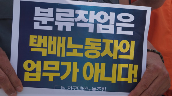 이들은 “얼마 전 로젠택배 노동자도 과로로 인한 뇌출혈로 쓰러지는 사고가 발생했다. 특히 전국 72곳 우체국에 소속된 택배노동자 모두는 여전히 분류작업을 하고 있고 이중 62곳에는 단 한 명의 분류인력도 투입되지 않았다”고 주장했다. 이어 “분류작업은 택배사의 몫이며 이를 통해 노동시간 단축이 이뤄져야 한다”고 강조했다.