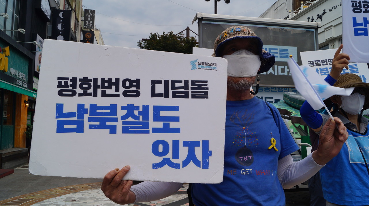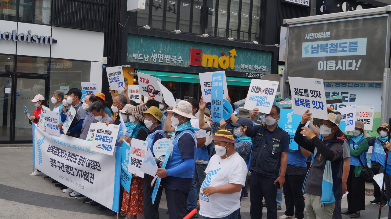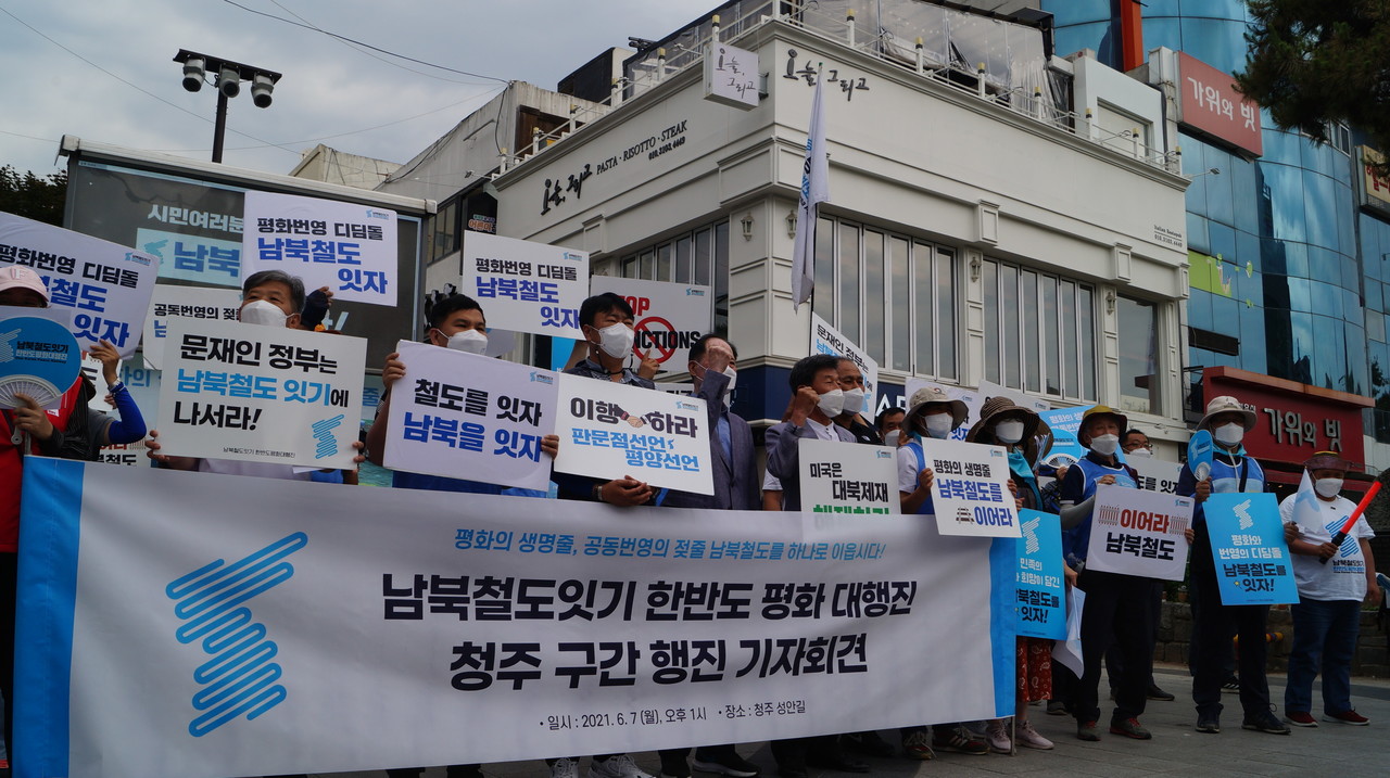 남북철도 잇기 한반도 평화대행진 추진위원회(이하 추진위)가 7일 청주를 행진하며 성안길에서 기자회견을 열었다.