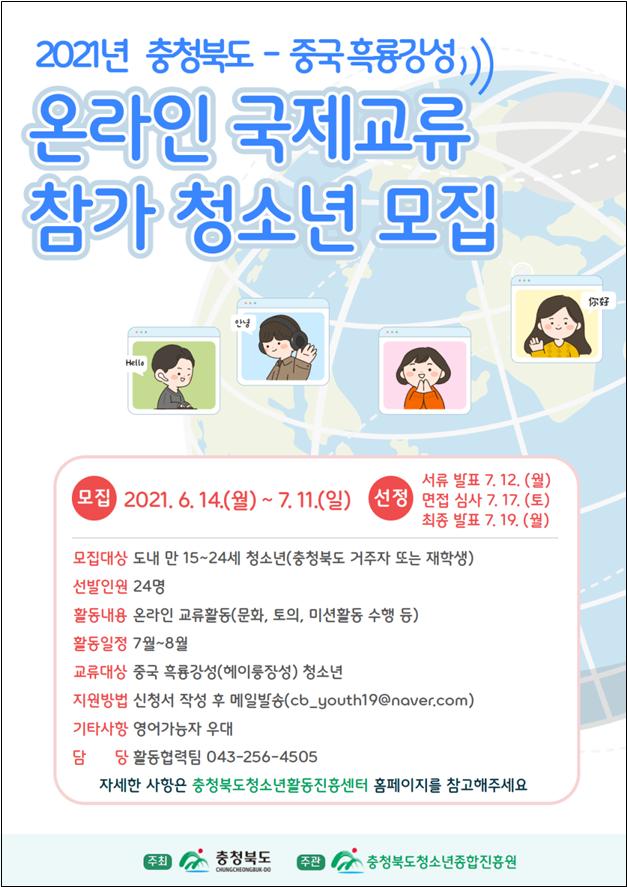 충북도가 주최하고 충북청소년종합진흥원이 주관하는 ‘충북·중국 흑룡강성 청소년 국제교류’가 8월 21일부터 8월 29일까지 온라인으로 열린다.