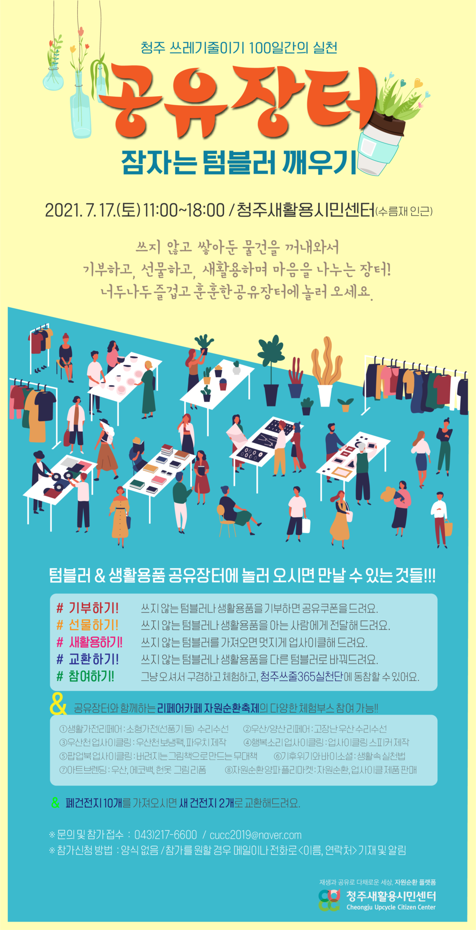 오는 17일 청주새활용시민센터(관장 염우·이하 새활용센터)는 청주시민과 함께 하는 ‘자원순환 공유장터, 잠자는 텀블러 깨우기’ 행사를 개최한다.