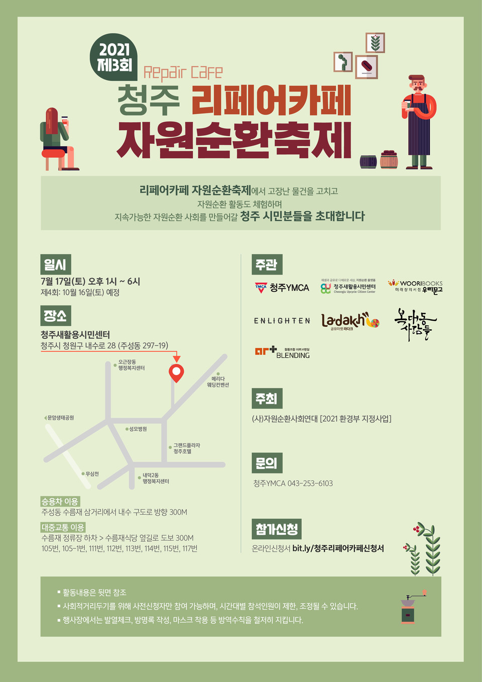 공유장터 외에도 이날 행사는 소형가전 등 고장난 물건 수리, 우산천 새활용, 아트브렌딩, 플리마켓 등 다양한 자원순환 및 새활용 체험부스가 운영되는 ‘2021 리페어카페 자원순환축제’도 함께 열린다.