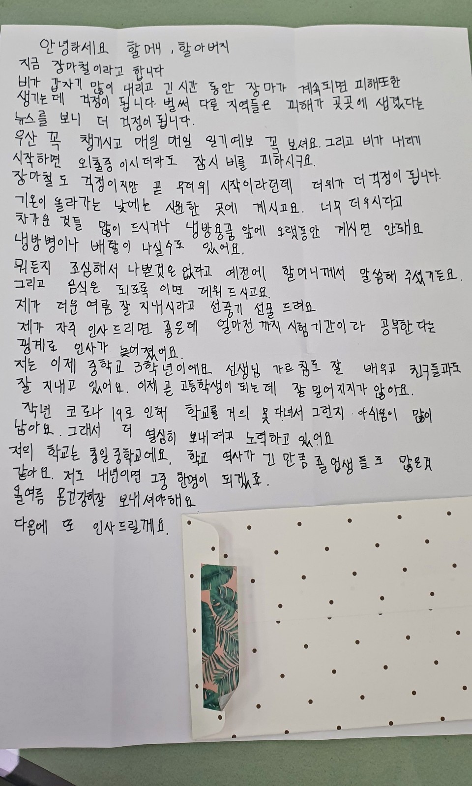 이 편지에는 "기온이 올라가는 낮에는 시원한 곳에 계시고, 너무 더우시다고 차가운 것들 많이 드시거나 냉방용품 앞에 오랬동안 계시면 안된다"며 "제가 더운 여름 잘 지내시라고 선풍기 선물 드려요"라는 내용이 담겼다.