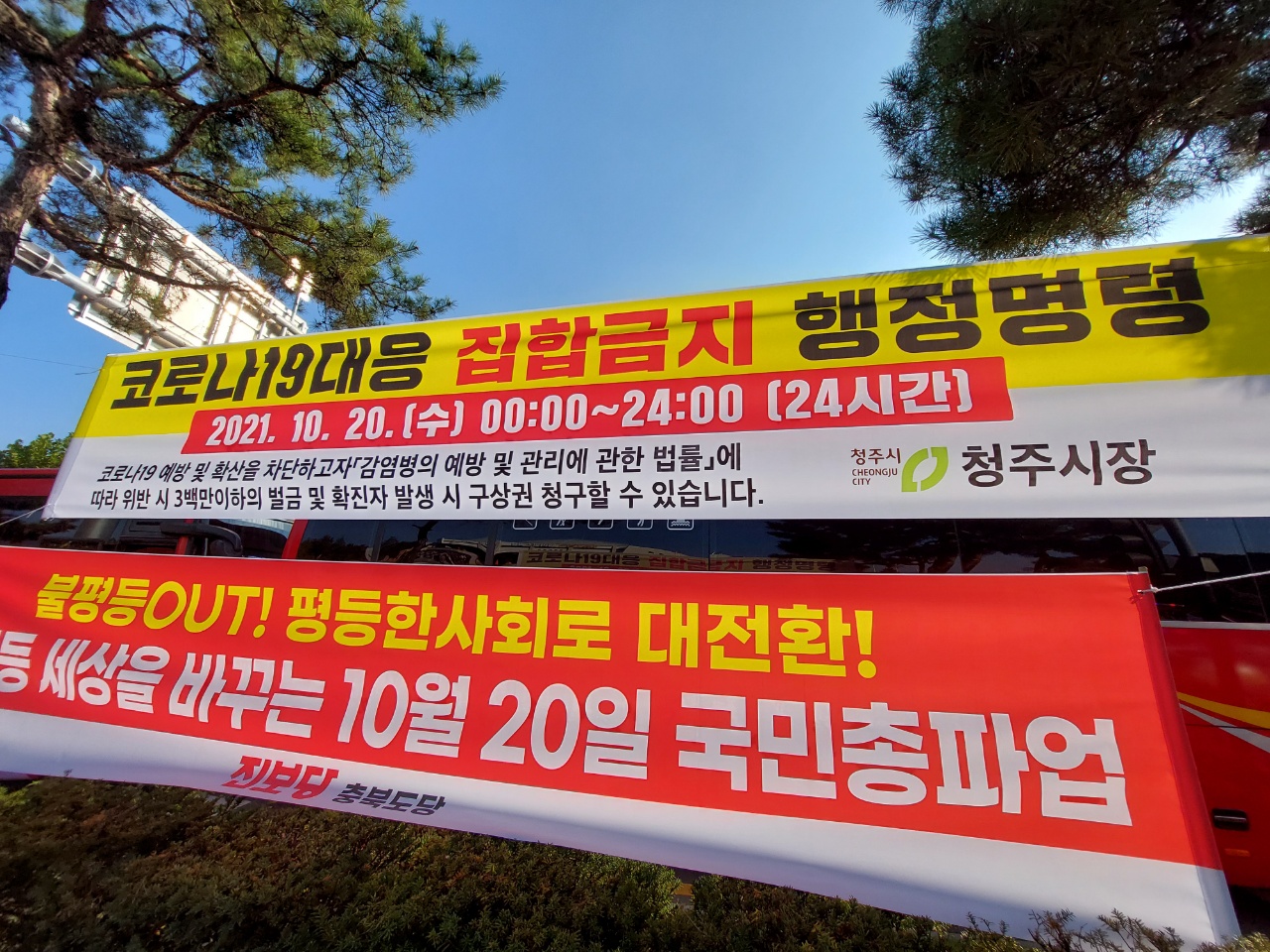 ‘불평등 타파! 평등사회로 대전환’을 촉구하는 ‘민주노총 1020 총파업 충북대회’가 20일 청주체육관 앞에서 열렸다. 민주노총 충북지역본부가 주최한 이번 대회에는 충북지역 노동자 500여명이 참여, 참가자들은 노조별 요구사항을 밝히고 투쟁을 다짐했다.