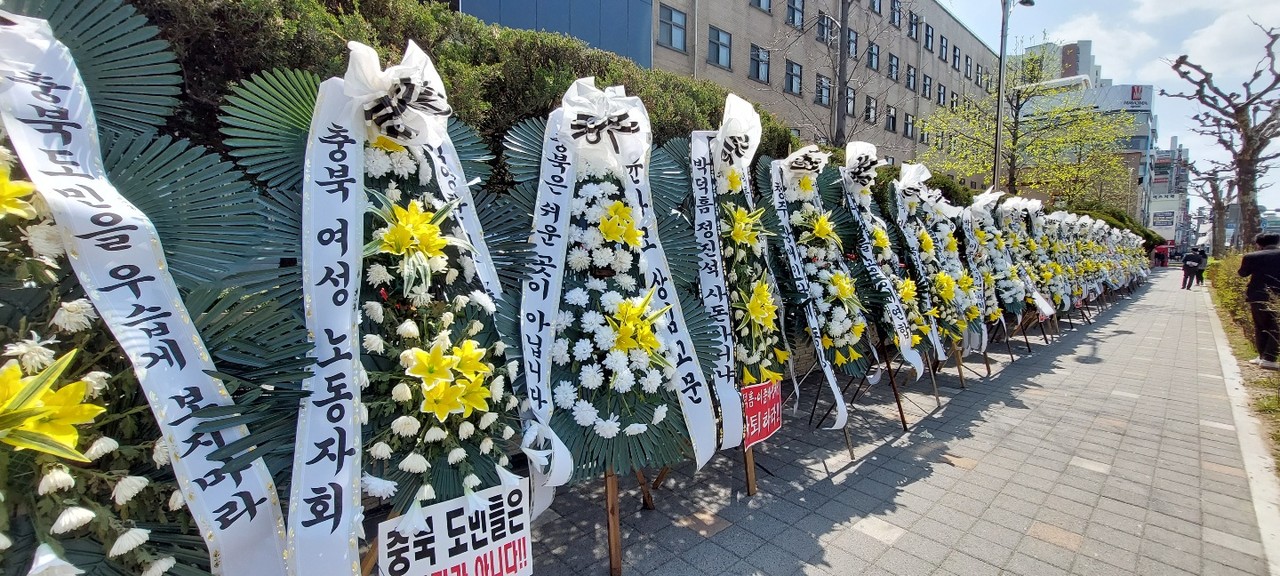 충북지역 시민단체들이 8일 충북도청 앞에 설치된 근조화환을 두고 시민단체를 우롱하는 처사라며 강력 항의하는 가운데 근조화환을 설치한 윤사모(윤석렬을 사랑하는 모임)는 시민단체 이름을 일부 도용한 것을 인정하면서도, ‘이름에 특허가 있는 건 아니지 않느냐’며 반박하고 있다.