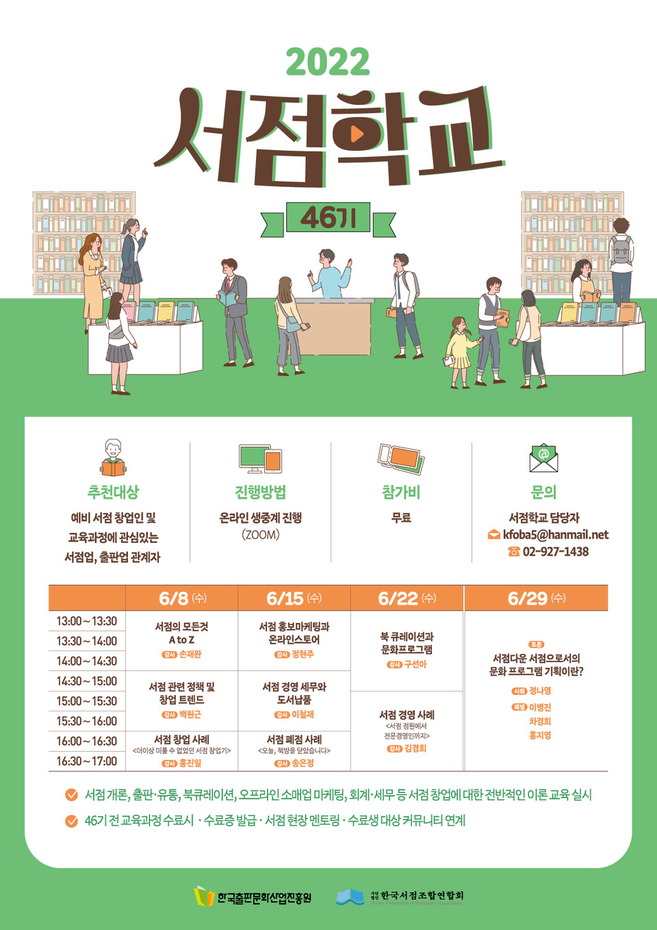 (사)한국서점조합연합회(이하 한국서련)가 오는 6월 8일부터 진행할 ‘2022년 제46기 서점학교’ 수강생을 모집한다.