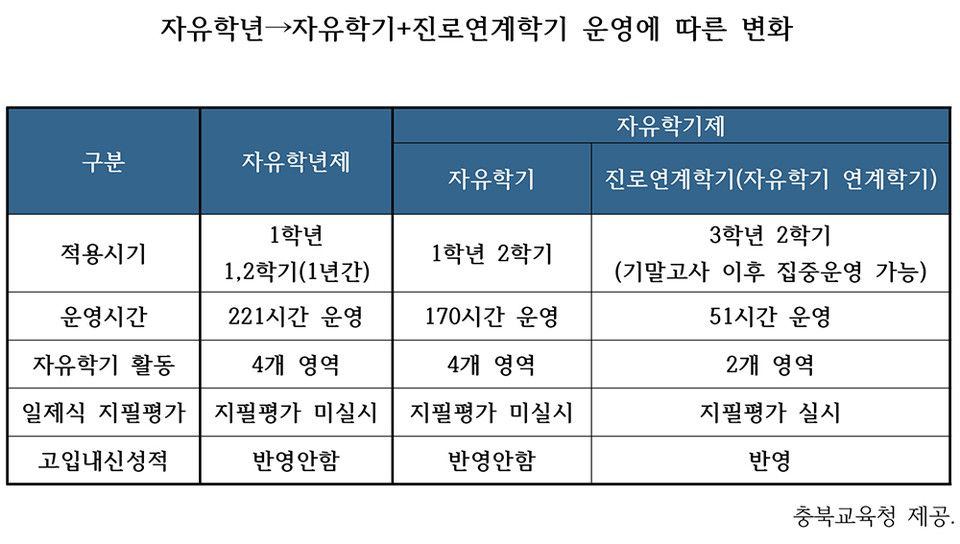 충북교육청은 13일 현재 1년 동안 실시되던 중1 자유학년제를 내년도 입학생부터 1학년 2학기와 3학년 2학기 진로연계학기로 나눠 운영한다고 밝혔다.