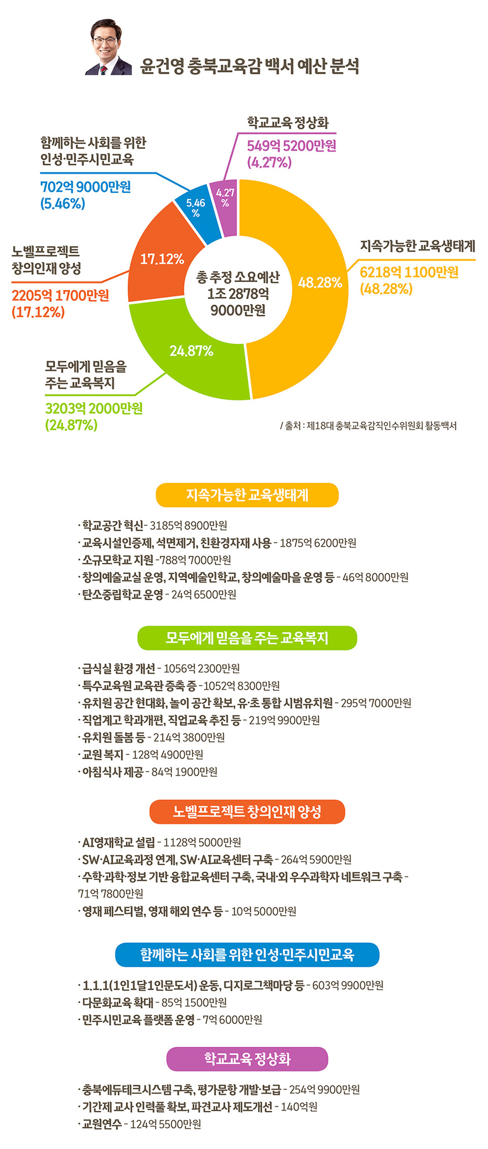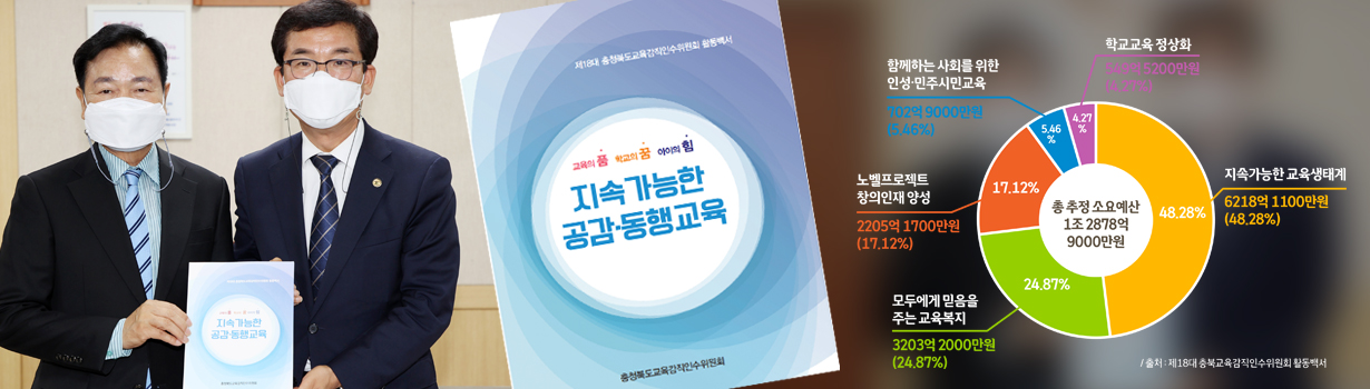 윤건영 교육감 인수위는 ‘지속가능한 공감·동행교육’을 비전으로 5대 핵심공약과 46개 추진과제를 제시했다. 총 추정 소요예산은 1조 2878억 9000만원이다.