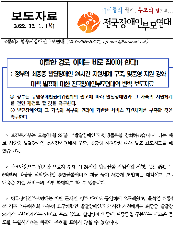 청주시장애인부모연대, 복지부 발달장애인 돌봄 강화 대책 비판