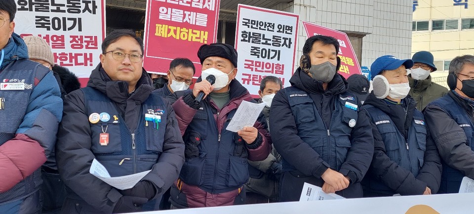 김선혁 민주노총 충북본부장은 이날 기자회견에서 “안전운임제는 노동자의 안전과 생명, 공공성을 위한 노동자들의 절박한 몸짓이었다. 그러나 윤석열 정부는 화물연대 파업을 재난으로 선포하고 북한 도발과 비유하며 국가의 적으로 규정했다”고 비판했다.
